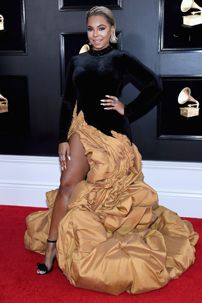 Ashanti looked splendid in this velvet gown with a sprawling skirt. We are absolutely loving the thigh-high slit and the strappy shoes.