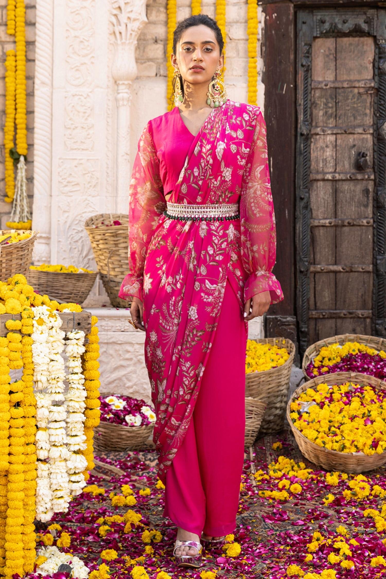 The hot pink pre-draped saree set by Chhavvi Aggarwal is an absolute winner for all of us at Aza Fashions. Featuring a printed blouse with flared pants and an attached drape, you can pair the look with long earrings with pearl details from our jewellery curate and make heads turn at the Sangeet function.