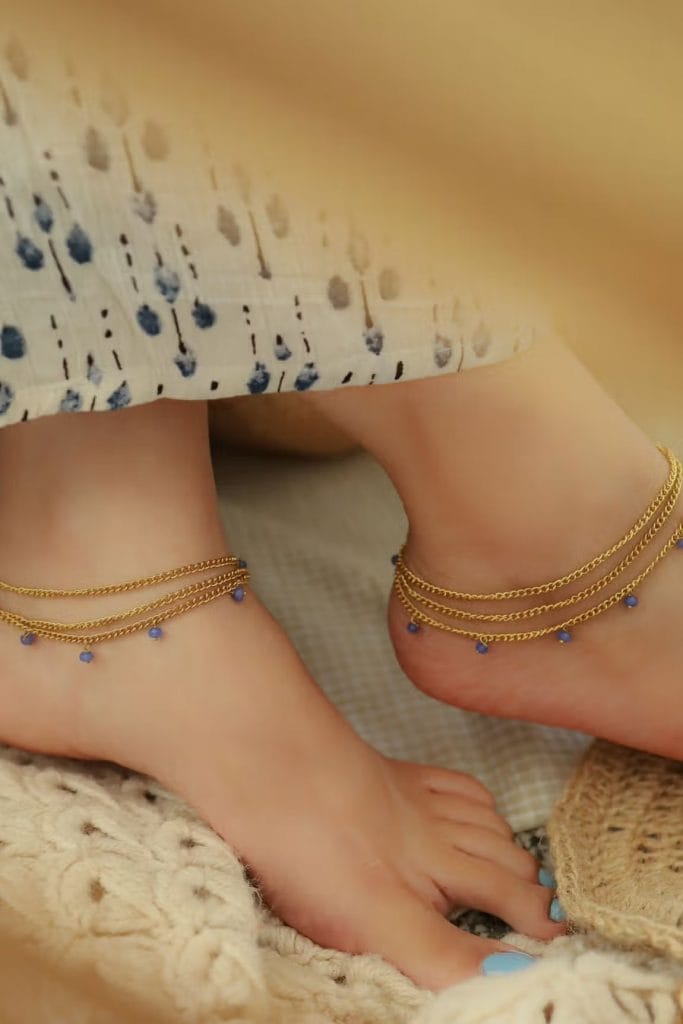 Have you ever found yourself admiring a beautiful pair of anklets and wondered how they can make your feet look so elegant? Well, look no further because we have the perfect accessory for you - the Payal style anklets! These magnificent pieces of jewellery are the epitome of sophistication and will add a touch of glamour to any outfit. These anklets are a pair of gold-plated layered chain strings, studded with stunning semi-precious blue stone drops. The blue stones are hand-picked and add a pop of colour to the anklets, making them perfect for any occasion. Whether you're attending a wedding, going for a stroll on the beach, or just enjoying a day out with friends, these anklets will add a touch of glamour to your look.