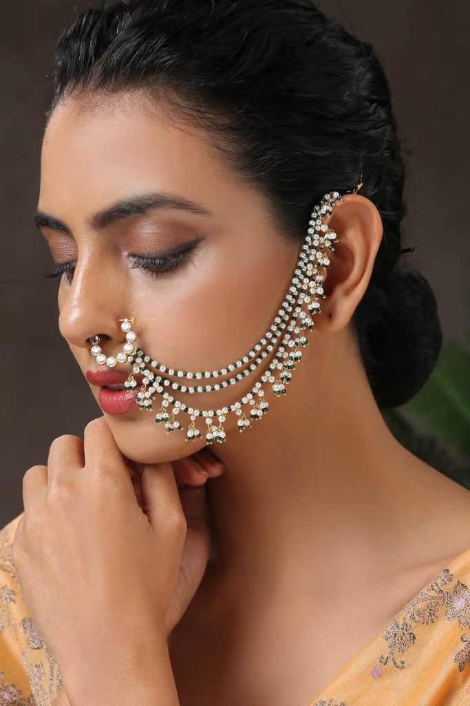 The Multi-Pearl Strand Nath from Paisley Pop is a modern take on this traditional piece, with a touch of elegance and sophistication. Crafted with delicate care, this gold-plated nath is paired with an uncut polki nose ring. The round nose pin adds a smooth and comfortable fit, while the handcrafted design ensures the highest quality and attention to detail. The combination of the gold and silver alloy creates a warm and rich tone that will complement any skin tone. The pearls, in their pristine white shade, add a touch of sophistication, while the green stones bring a pop of colour to the design. The strewn strings of pearls and stones dangle gracefully from the nose ring, creating a stunning and eye-catching display. Whether you're looking to add a touch of tradition or simply want to elevate your style, this nath is a perfect choice.
