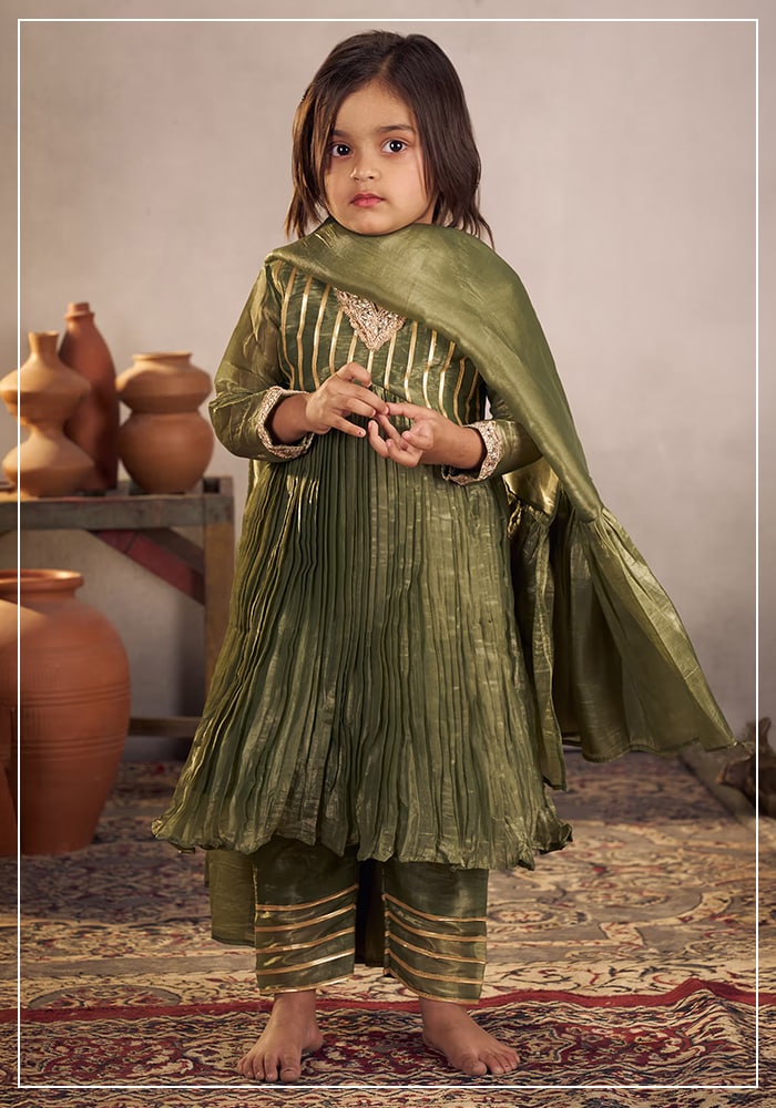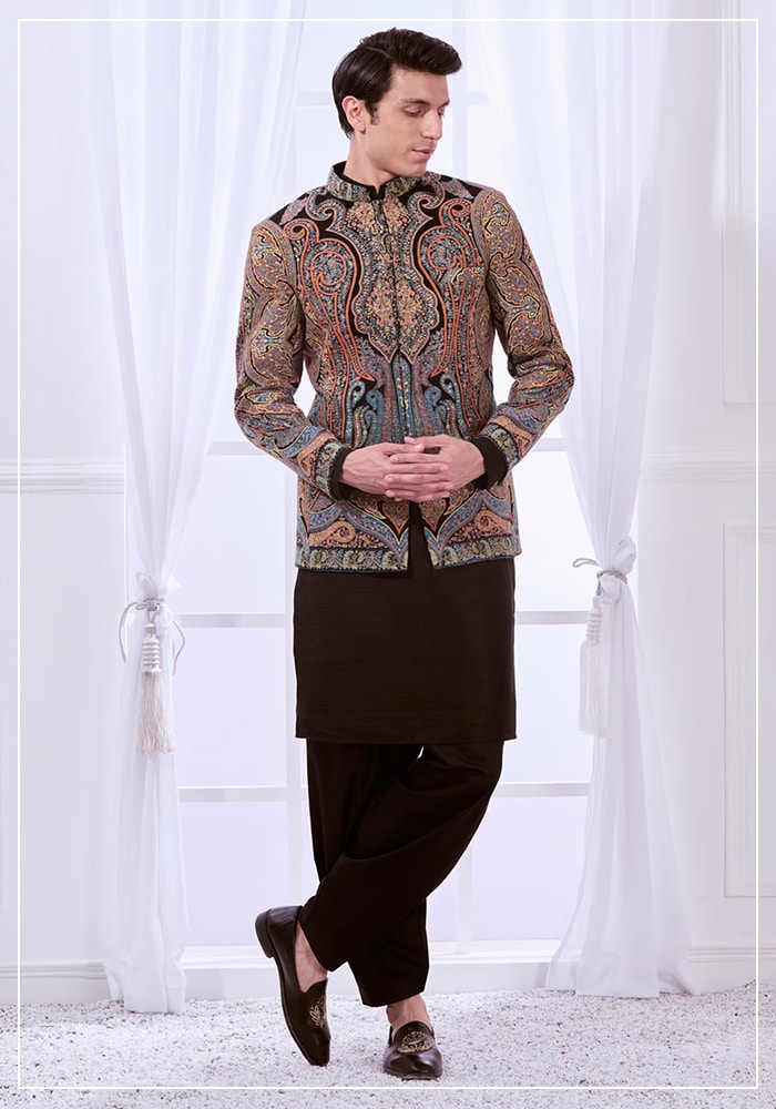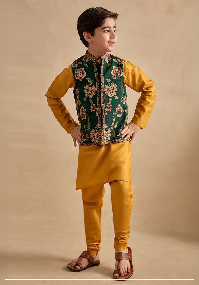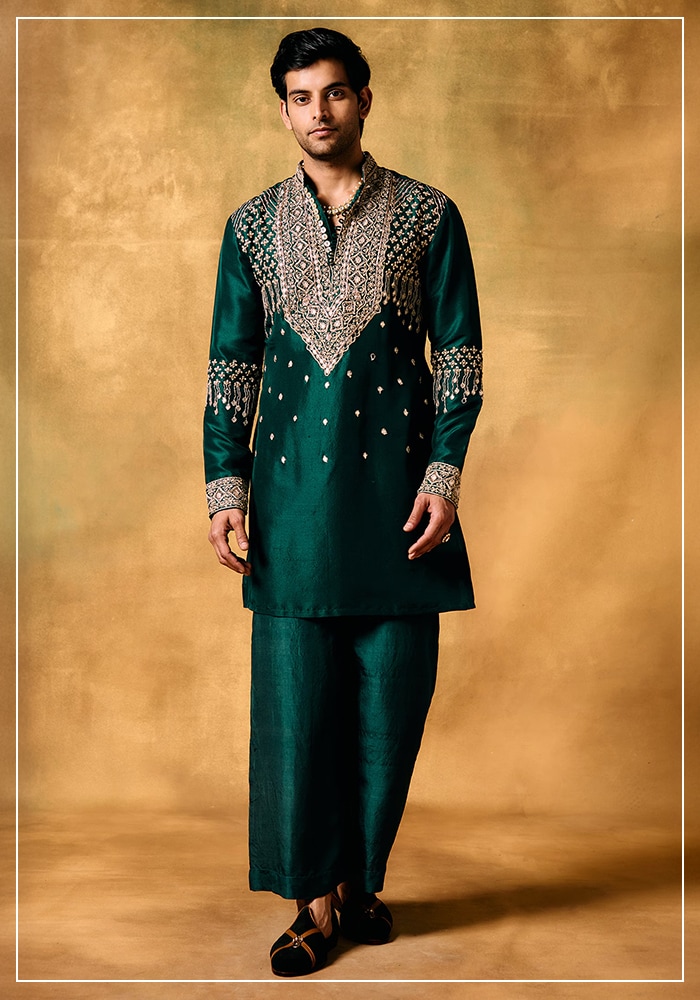 - أطقم احتفالية متناسقة: كورتا مع سراويل مريحة وجاكيت بندغالا مطرّز، بأقمشة قابلة للتنفس لمظهر عصري متجذر في الثقافة.