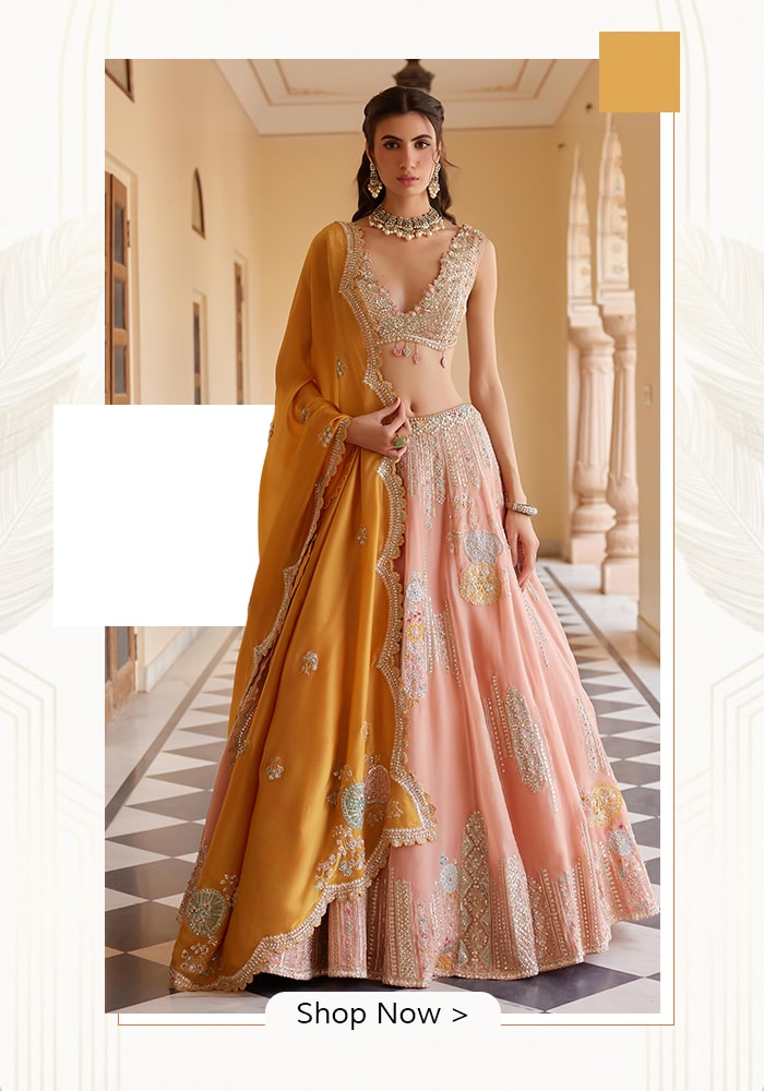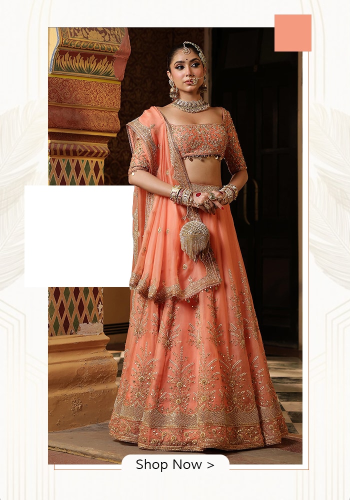 Moreover, peach wedding outfits look stunning in photographs. They are extremely photogenic in natural light, especially during golden hour ceremonies, when the fabric catches warmth and glow without overpowering the bride. Variations like blush peach and muted champagne peach allow embroidery and textures to shine while keeping the overall look light and elegant.