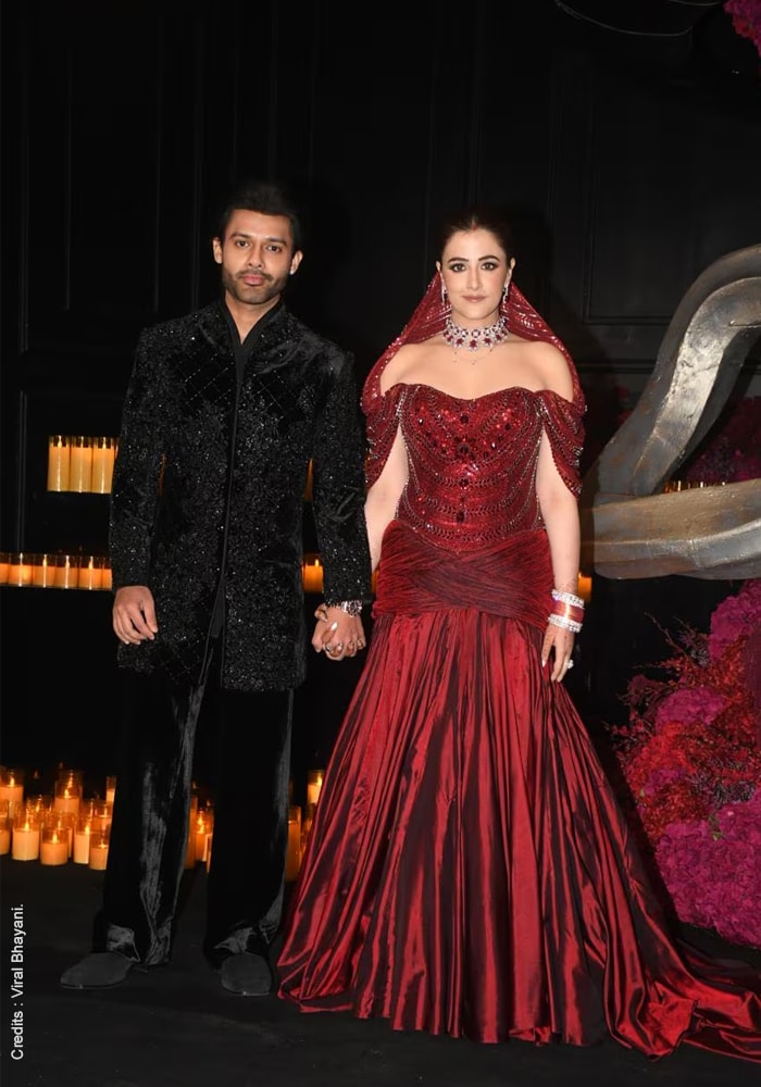 Dressing well often means enhancing what is already present, and this silhouette achieved exactly that. The mermaid cut created fluidity and structure at the same time, adding drama without excess. The deep maroon palette was an elegant choice, bringing richness and romance to the evening festivities. The next time you think of a color to look glam for your evening, think maroon, for it adds depth and intensity to them. Nupur’s reception further reinforces the idea that traditional bridal rules no longer define wedding wardrobes.