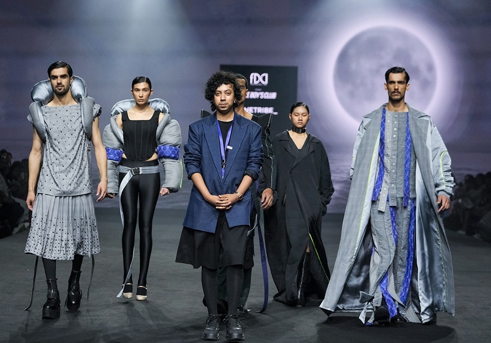 With 'Monolith', LINETRIBE_ showcased a collection of layered silhouettes, oversized jackets, crisp tie-dye and intricate quilting with impeccable tailoring deeply rooted in androgyny and identity.