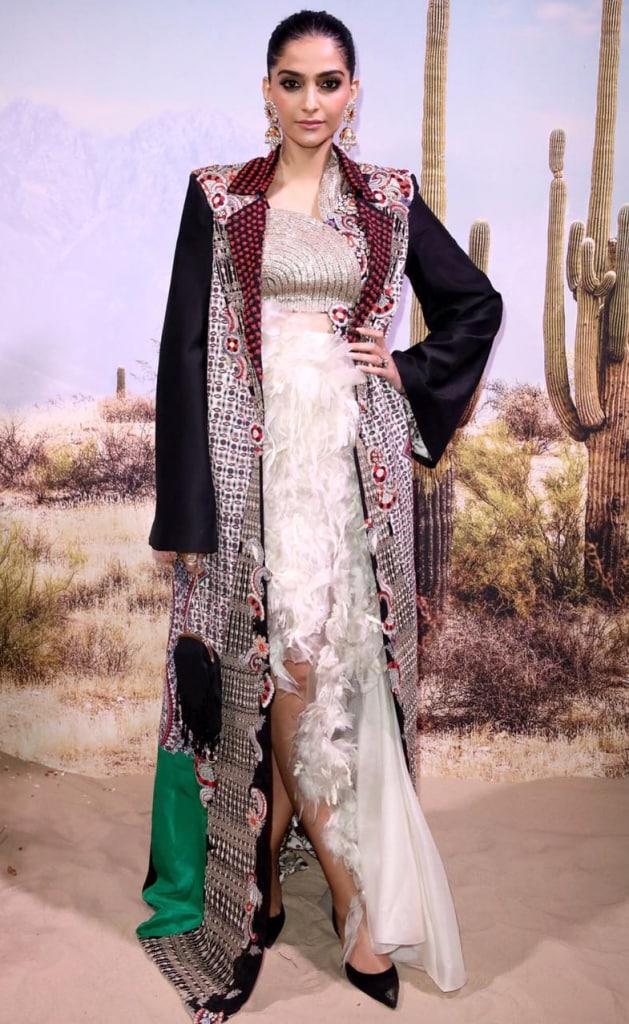 Satin ruffles and feathers? So Sonam! She wore this exaggerated dress with a super tribal jacket at the Business of Fashion gala dinner party. It takes courage to pull off such a heavily embellished outfit, that too paired with traditional earrings, black micro-bag, and heels, along with smokey eyes.