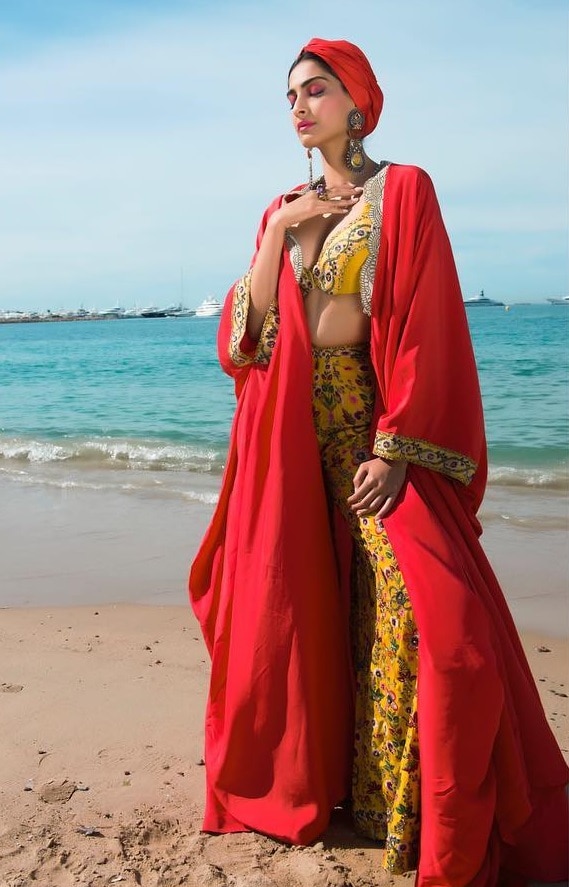 Sonam is a Cannes-constant. Moreover, with Anamika Khanna outfits, of course. This printed yellow boho-chic bralette and pant set with an over-sized red jacket totally swept us off our feet. The social media (and us) were not prepared for this stunning look that was accentuated with statement oxidized jhumkas and a turban.