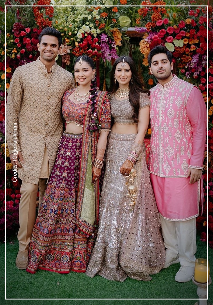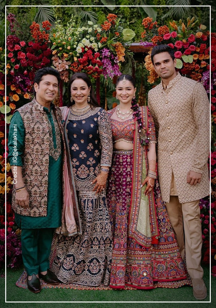 The families also made stylish appearances. Sachin Tendulkar chose a green kurta-pyjama set layered with a printed vest, while Anjali Tendulkar opted for a fuss-free sharara set with a short kurta. Sara Tendulkar stood out in a vibrant multi-hued lehenga with red as the base colour, styled with a two-tiered necklace, matching earrings, and a maang tikka.