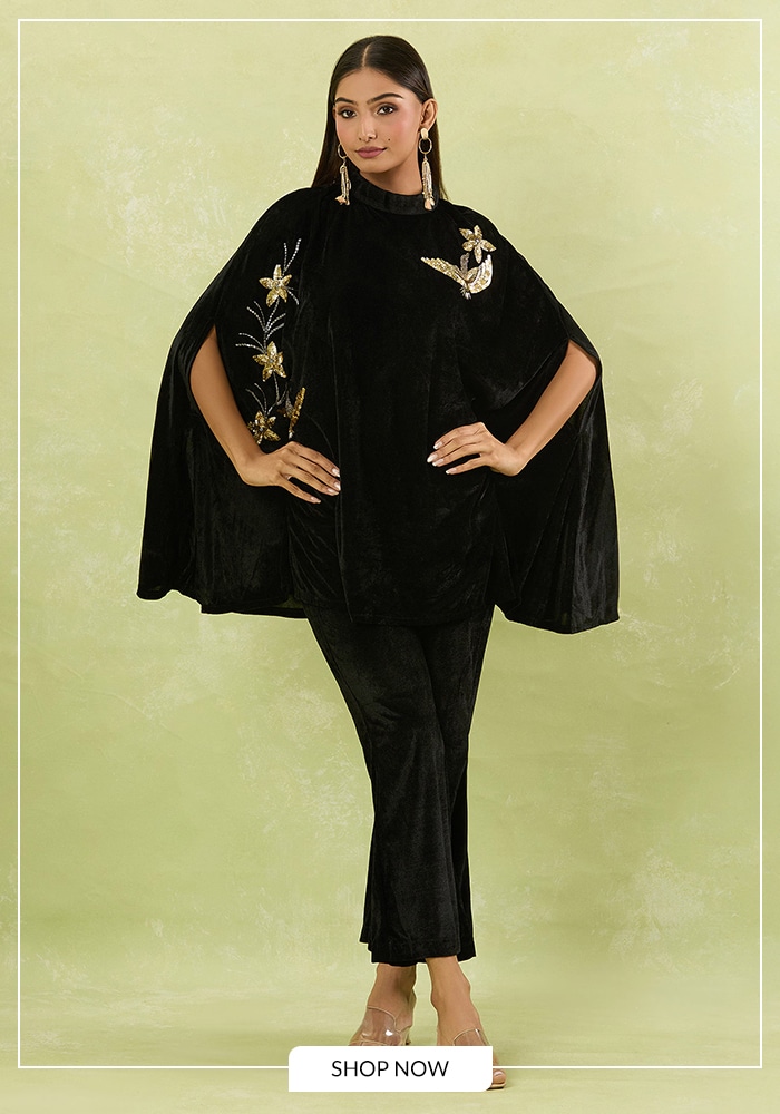 1. Samyukta Singhania Black Velvet Cape & Pant Set
