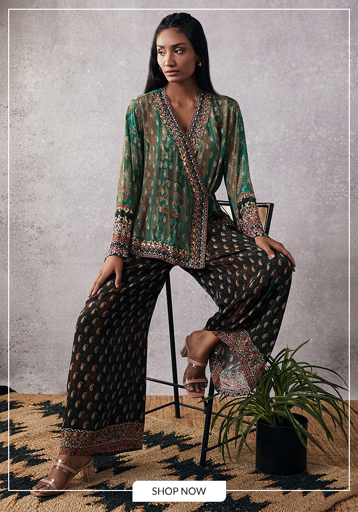 Vibrancy and tradition meet in our second best seller, the Ikaya Angrakha and Palazzo Set by Soup By Sougat Paul. This outfit is a celebration of color and pattern, designed for the woman who loves to make a statement. The multicolor angrakha is crafted from lightweight green crepe and features a stunning paisley print that feels both classic and contemporary.