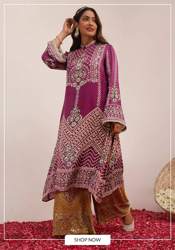 The flattering V-neckline and full sleeves are complemented by playful tassels, adding a touch of bohemian flair. The wrap-style angrakha silhouette cinches at the waist, creating a graceful shape that flows beautifully. Paired with wide-leg palazzos, this set offers unrestricted movement and an effortlessly chic look. It's the perfect outfit for festive gatherings, destination weddings, or any occasion where you want your style to shine.