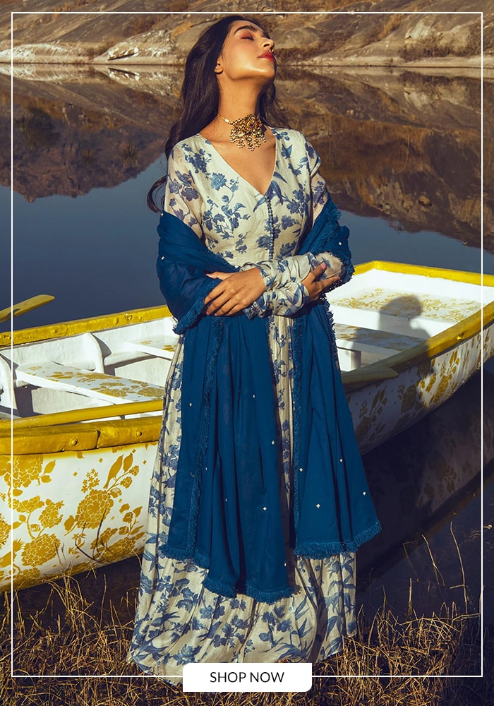 Classic elegance gets a refreshing update with the Paulmi and Harsh Blue Anarkali Set. This stunning indigo blue and off-white anarkali suit has captivated buyers with its timeless charm and delicate details. The soft mul cotton fabric is adorned with an all-over bird motif print, adding a whimsical and artistic touch to the traditional silhouette.