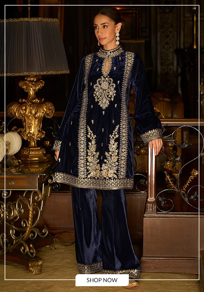 Rounding out our list is another masterpiece from Lashkaraa, the Blue Velvet Kurta and Pant Set. This outfit is a lesson in refined luxury, combining rich texture with brilliant embellishment. The deep blue velvet kurta set immediately commands attention with its high collar and sophisticated keyhole neckline.