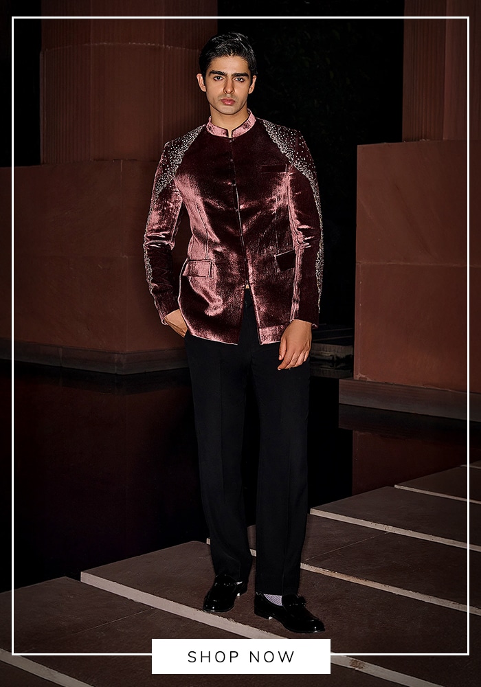 Styling Tips: Keep the embroidery minimal, perhaps focusing just on the collar and cuffs with zardozi or antique gold thread work. Pair the plush jacket with contrasting raw silk trousers. Finish the look with embroidered mojaris that pick up the metallic accents of your jacket.