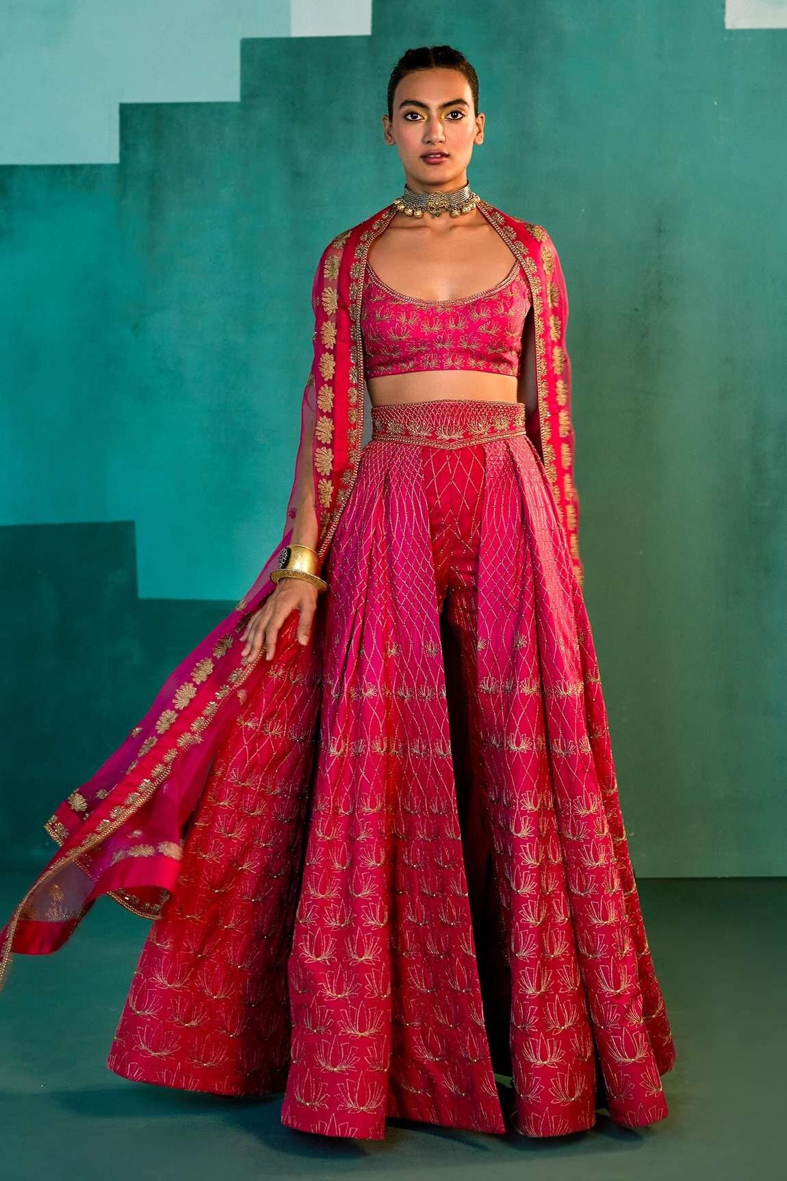 Trade up your pant suits for this designer pant lehenga set from Agunj By Gunjan Arora. A powerful pink armour complete with a cape for the modern woman.