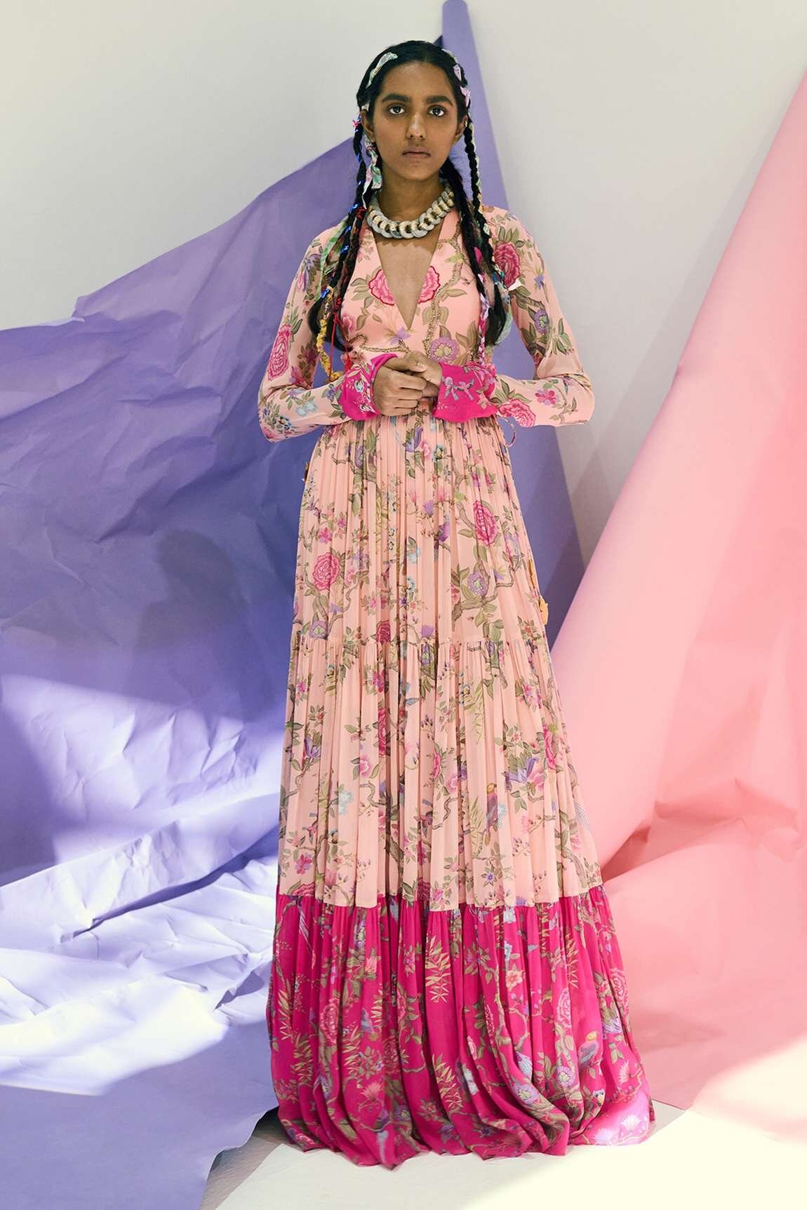 Look pretty in pink with this floral tiered dress from Limerick By Abirr N’ Nanki. The perfect designer dress for those who appreciate the maximalism of the trend but are not committed to the head-to-toe hot pink look.