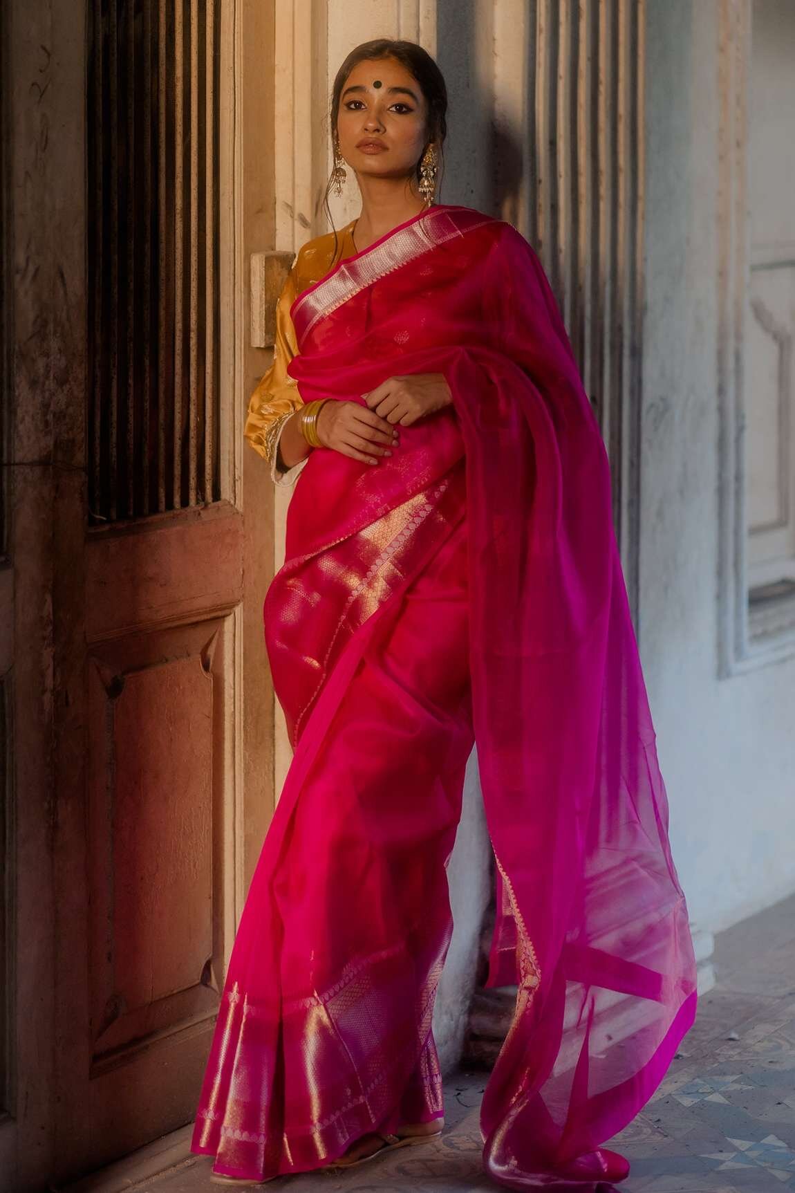This organza silk in fuchsia makes for such a dreamy and romantic saree. The sheer fabric creates layers and depth with each pleat and has the soft gleam of a sweet daydream. This Mimamsaa designer saree is featured from their collection Chokher Bali and is your sign to incorporate Barbiecore into ethnic wear.