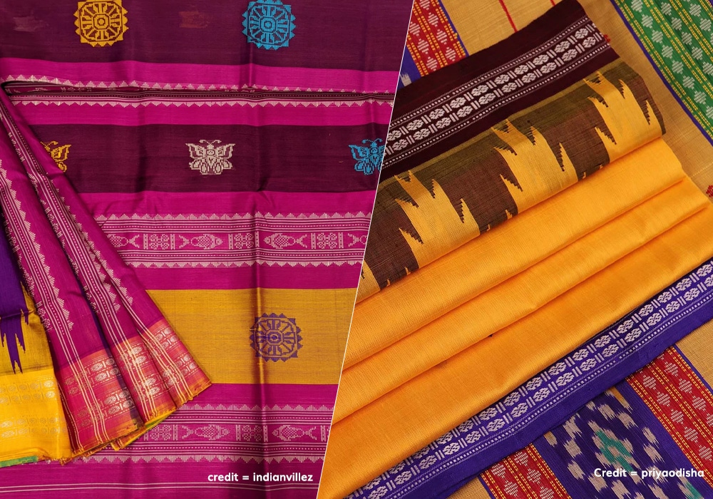 The Berhampuri Patta is a handloom silk saree that originates from the city of Berhampur in the Ganjam district of Odisha. It is renowned for its distinctive design, which features a Kumbha, or temple spire motif, woven along the border. This gives the saree a sacred and traditional identity. One of the most unique aspects of the Berhampuri Patta is that it is traditionally woven as a pair. For every saree created for the woman, a matching silk joda (dhoti or stole) is woven for the man. This signifies unity and was often used by couples during religious ceremonies and weddings. The sarees are known for their vibrant, contrasting colors and a heavily decorated pallu (the decorative end piece).A Weave with Royal and Divine Connections