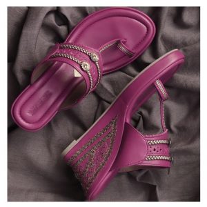 Think: traditional Kolhapuris getting an eclectic makeover with abundant colours and heels. This brand stands for chic contemporary footwear that is chock-full of new-age design elements and vivacious hues. Reserve these quirky footwear styles to attend an intimate wedding in.