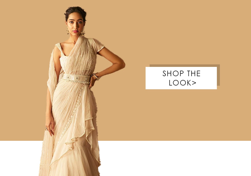 Imbibing European influences mixed with traditional Indian aesthetics is Riddhi Mehra's classic creations. We’re totally rooting for this statement-making white pre-draped ruffle saree that radiates effortless elegance. Paired with a floral blouse and jewel embroidered tassel belt, this sari defies convention and promises to depart from the traditional red bride stereotype.