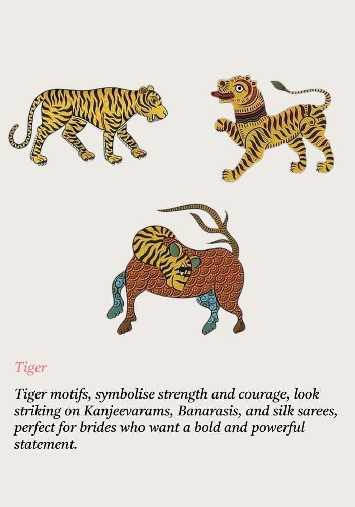 For the bold bride, the tiger is the ultimate symbol. Associated with the goddess Durga, the tiger represents Shakti—divine feminine power, courage, and fearlessness. It is a motif for the woman who enters her marriage as an equal partner, strong and self-assured.