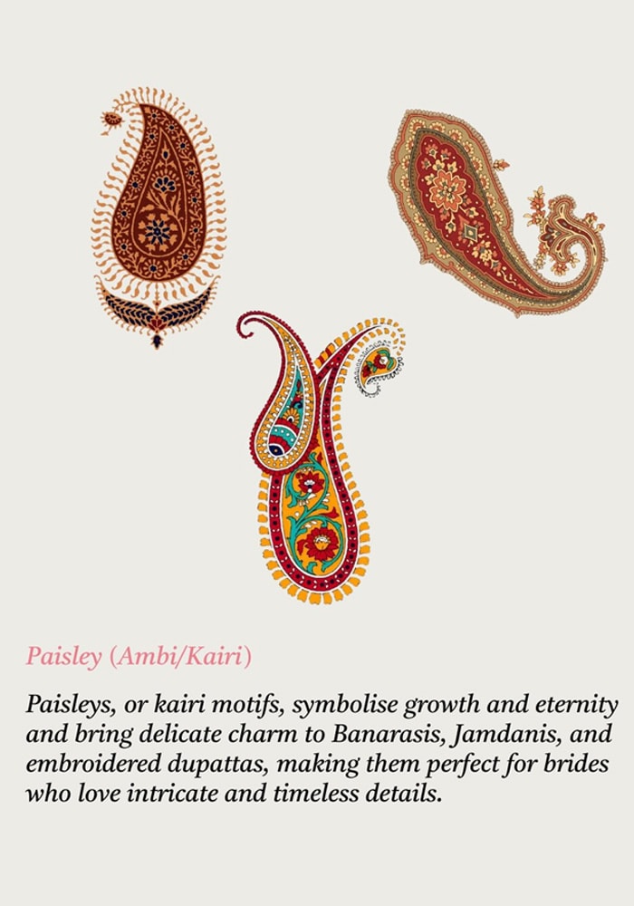 The paisley, or Kairi (meaning unripe mango), is a staple in South Asian textiles. Its curved teardrop shape represents a seed, symbolizing fertility, new beginnings, and eternal life. It is the visual representation of growth—perfect for a couple starting their journey together.