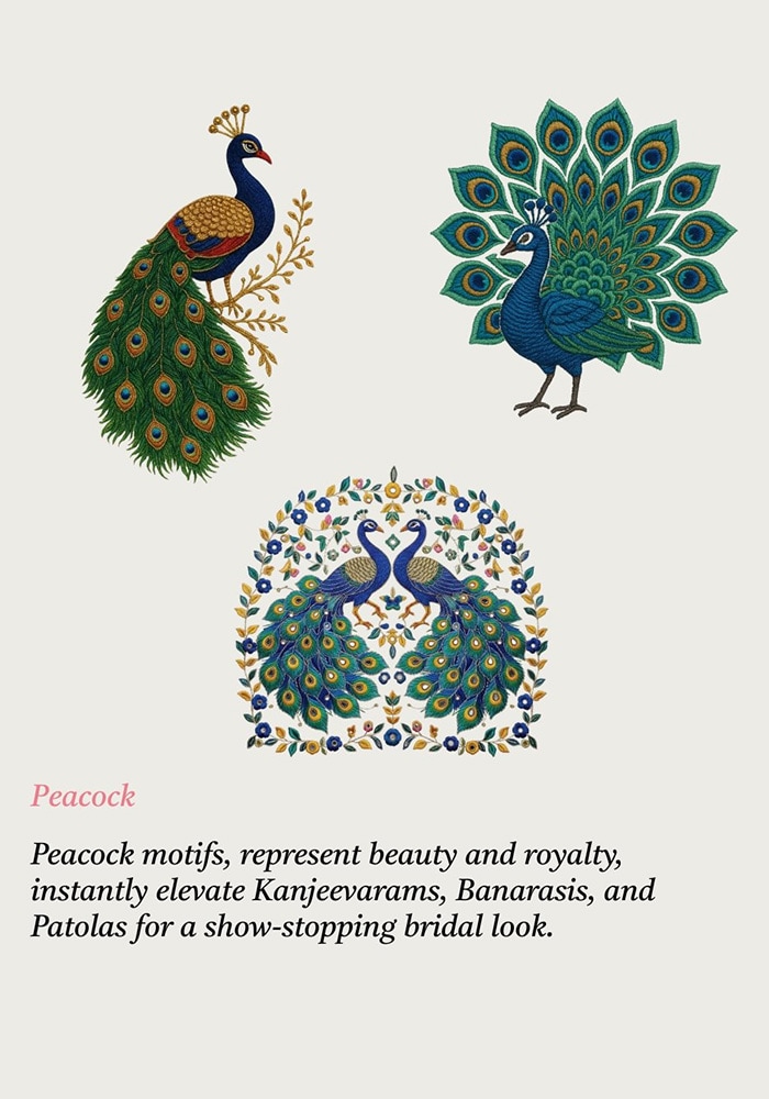While multicolored peacock embroidery is classic, the 2026 trend leans towards monochrome elegance. Imagine a gold peacock motif on a gold tissue saree, or silver thread work on a deep emerald velvet. The silhouette of the bird is enough to convey its grandeur without needing a rainbow of colors.