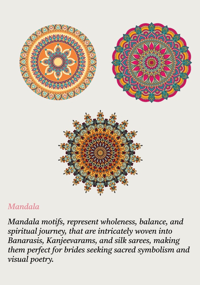 A mandala is a geometric configuration of symbols that represents the universe. In a spiritual context, it serves as a tool for focusing attention and establishing a sacred space. On bridal wear, the circular symmetry represents balance, wholeness, and the infinite cycle of life.
