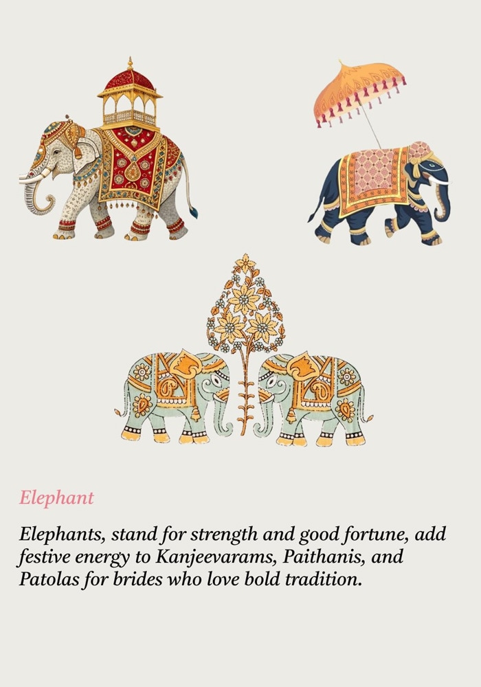 Elephants have always been associated with royal processions and festive grandeur. Spiritually, they represent Ganesha, the remover of obstacles. Wearing an elephant motif is a prayer for strength, wisdom, and a smooth path forward in your married life.