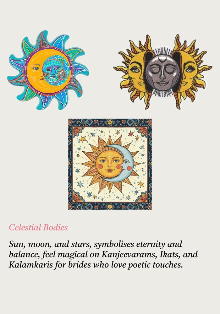 The sun (Surya) and moon (Chandra) represent the ultimate cosmic balance. The sun brings masculine energy, vitality, and power, while the moon represents feminine energy, coolness, and emotional depth. Together, they symbolize eternity—a love that lasts as long as the sun and moon shine.