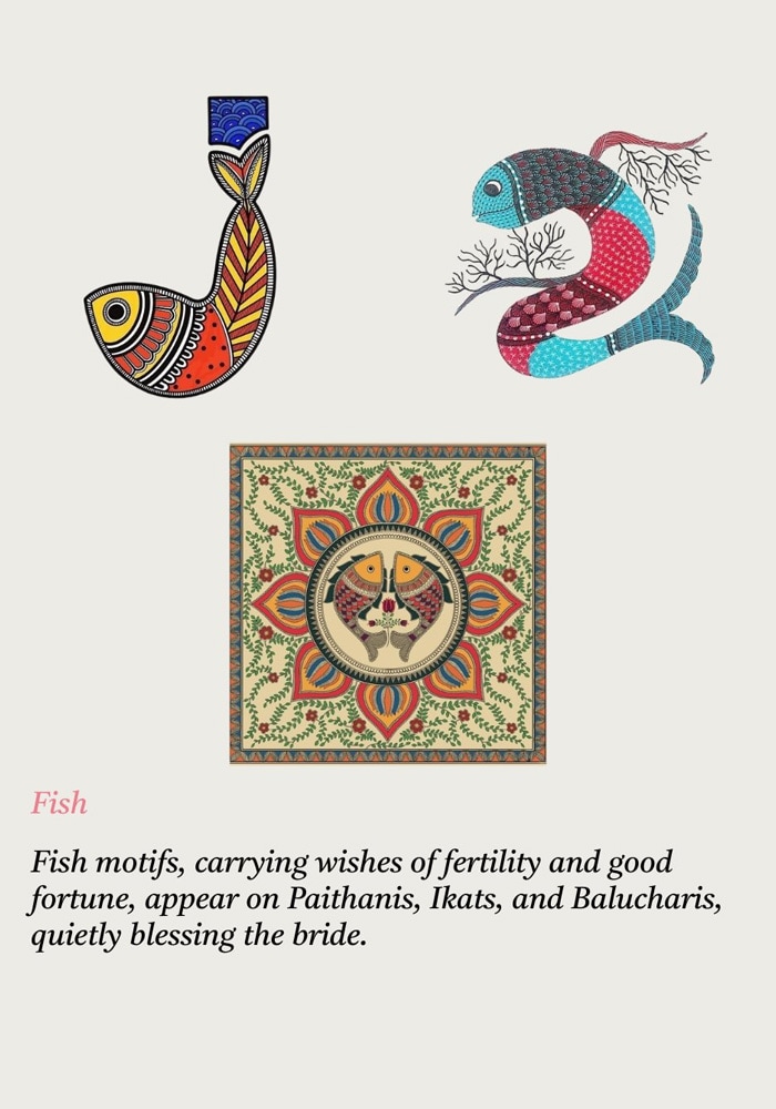 Fish motifs are deeply rooted in Madhubani art and Bengali weaves. For a 2026 bride, a hand-painted designer saree featuring stylized fish artwork adds an artistic, bohemian flair to a traditional outfit. It is a subtle nod to cultural roots that feels personal and unique.