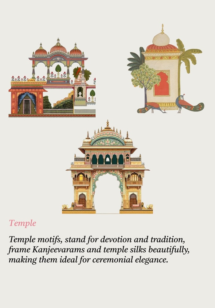Temple borders and architectural motifs ground a bridal look in devotion. They often depict the gopurams (towers) of South Indian temples or the arches of Mughal palaces. These designs remind us that marriage is a sacred institution, rooted in divine blessing.