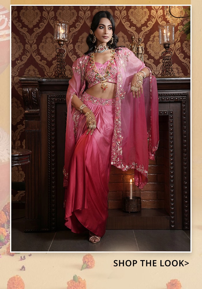8- Rosy Shine: Pink Draped Skirt and Cape Set