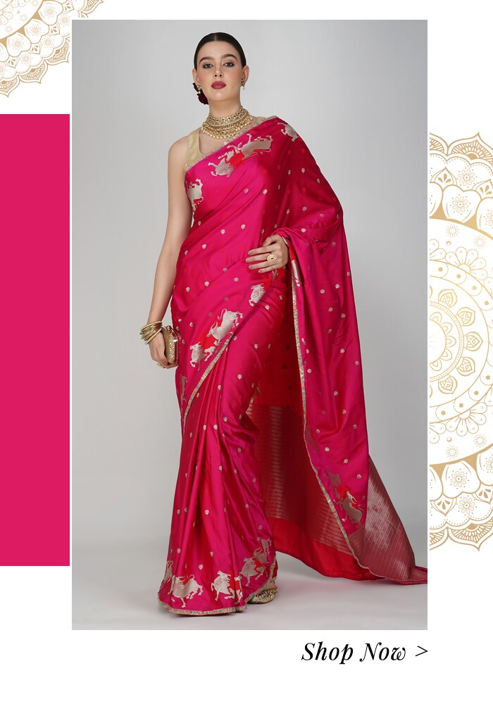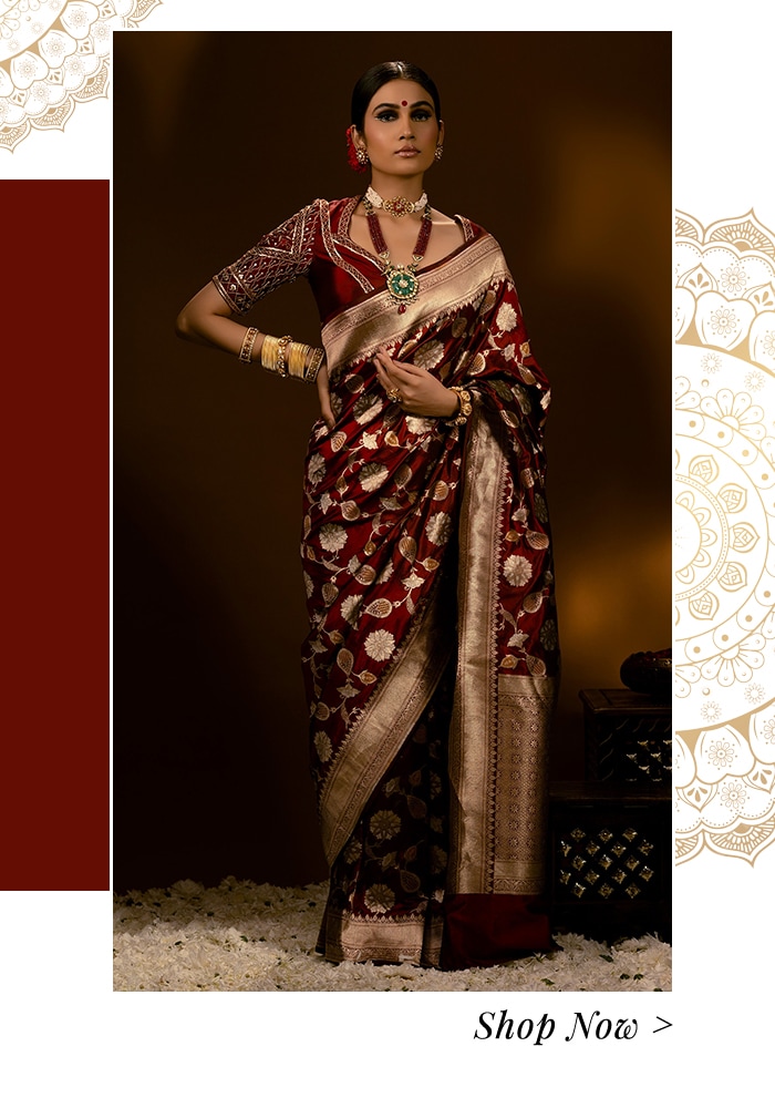 Banarasi Silk sarees are regal, rich and heirloom-worthy, featuring gold zari work and intricate handwoven motifs. Designer brands like Paaprika and Zal from Benaras are known for their elegant interpretation of classic kadhwa weaving. Ekaya Banaras and Sururchi Parakh bring royal aesthetics with royal deep reds and golds, perfect for pheras or traditional functions. Many brides choose a Banarasi saree for its cultural heritage, craftsmanship, and elegance.