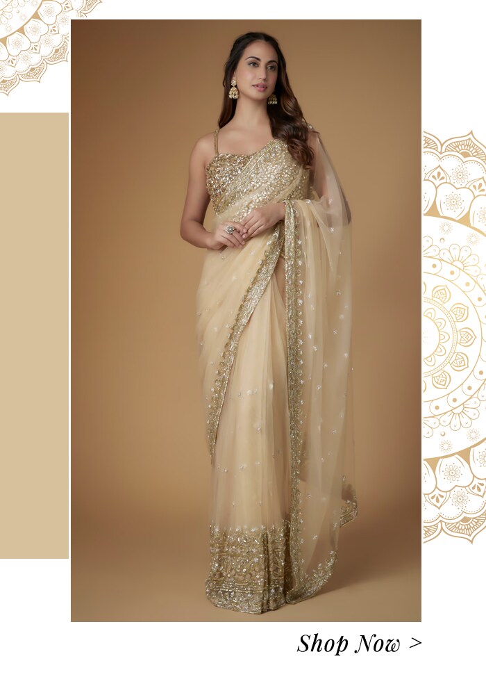 Soft, light, and sheer! Net and tulle sarees add sparkle to your engagement and evening receptions. Designers like Rabani & Rakha, Reeti Arneja and Ritu Kumar offer gorgeous and ethereal pieces with sequins, pearls, and fine threadwork in softer pastel and metallic colors. Net sarees are light yet dramatic and make the perfect pick for modern brides.