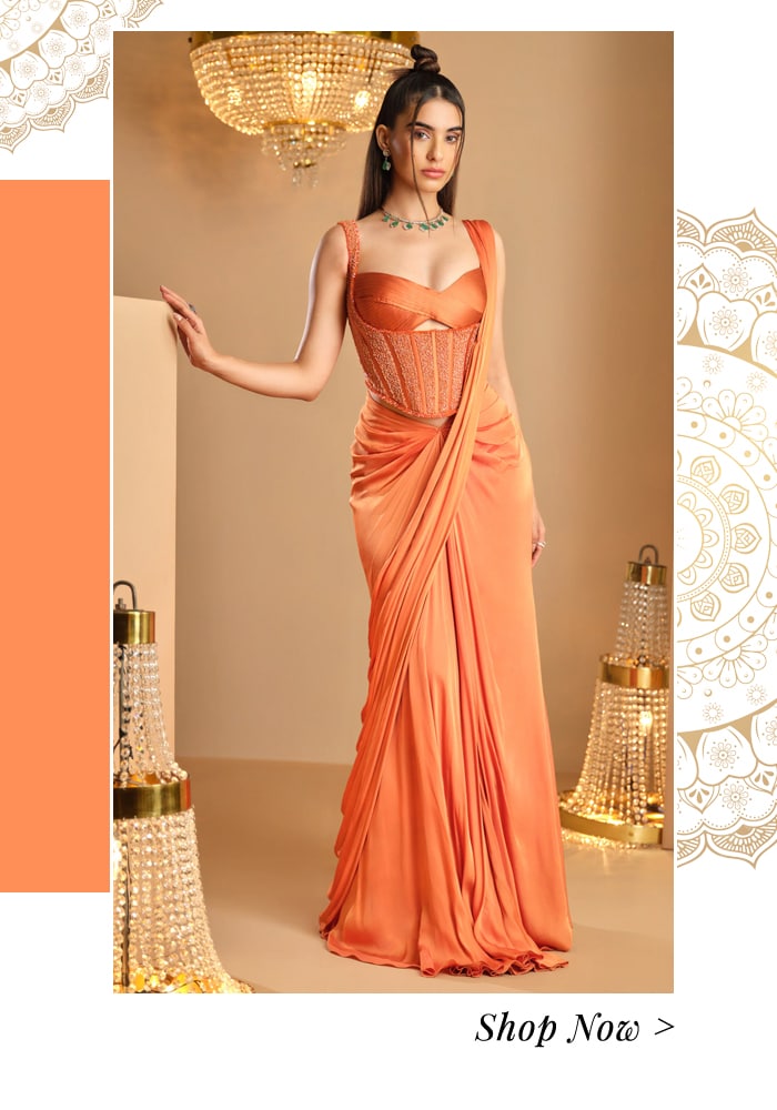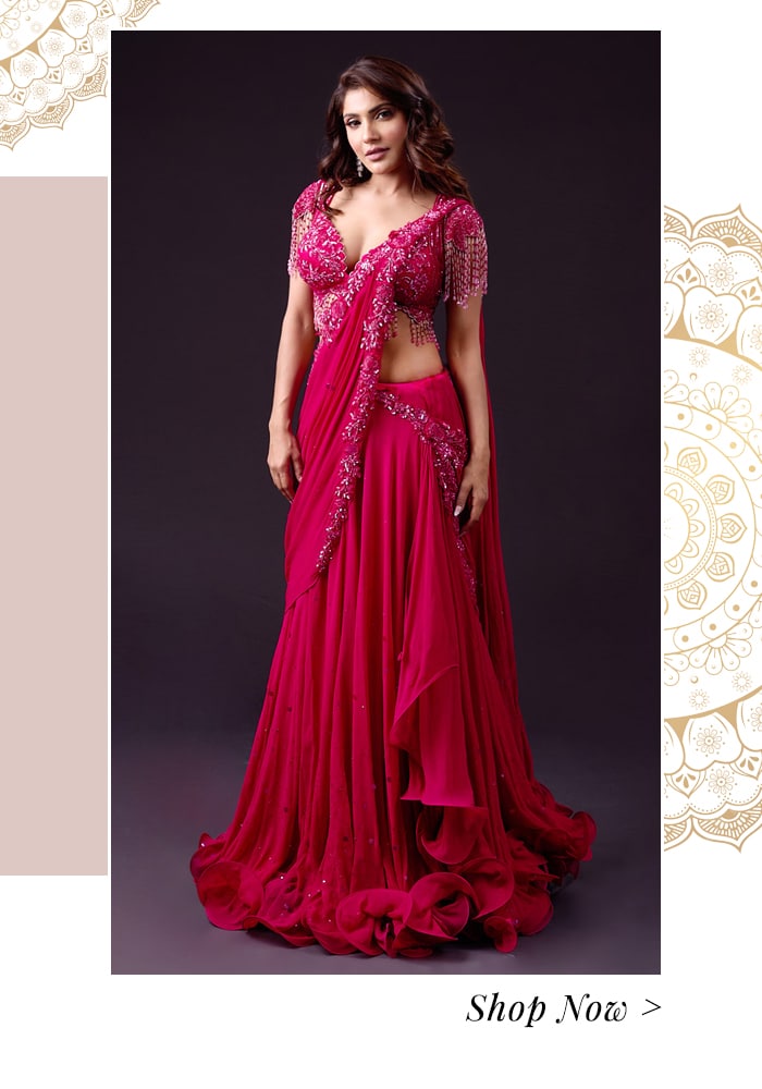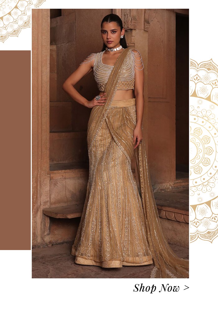 Modern brides love the ease of pre draped sarees. Designer labels like Nirmooha, K & A by Karishma and Ashita, and Basanti Kapde aur Koffee reimagined traditional sarees with modern draping techniques like corset blouses, structured fabric and embellished details. Pre draped sarees are an elegant and fuss-free option for sangeets and cocktail parties. They offer the grace of a saree with the ease of a gown, perfect for dancing the night away.