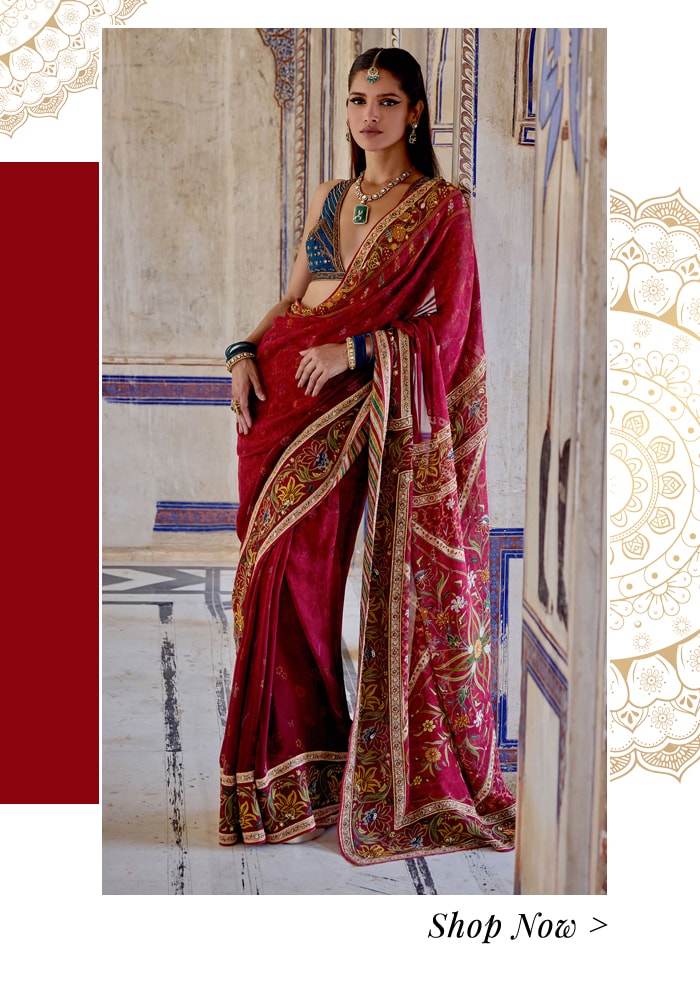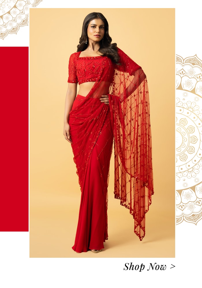 If you love sparkle, look no further than embellished sarees by Nidhika Shekhar, Prevasu, and Sue Mue. Adorned with sequins, mirrorwork and beadwork, these luxury sarees bring all the glamour you need for a cocktail or reception night. Their dazzling appeal pairs beautifully with statement jewellery and bold makeup. Brides who want to shine without the weight of a lehenga often turn to these stunning options for special occasions.