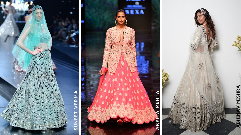 2023 saw our Instagram grids inundated with Swarovski crystal-encrusted outfits. This year, we're taking that bling and finding it in homegrown sources like mirrors from western India. Inspired by the sheesha embroidery from Gujarat, designers are using mirrors and merging it with the contemporary aesthetics of our modern bridalwear. Depending on which end of the 'bling' spectrum you prefer being on, explore styles which range from high-voltage glamorous pieces by Suneet Verma to more demure ones by Abhinav Mishra and Arpita Mehta and everything in between.