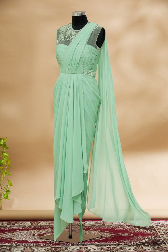 If you're chasing after pre-pleated styles, this ivory and gold number by the designer is what you should look toward. The mish-mash of the hues and the scintillating Swarovski diamonds (yes!) make this piece our personal favourite. Style with a taut choker set, and we promise the attention is guaranteed!