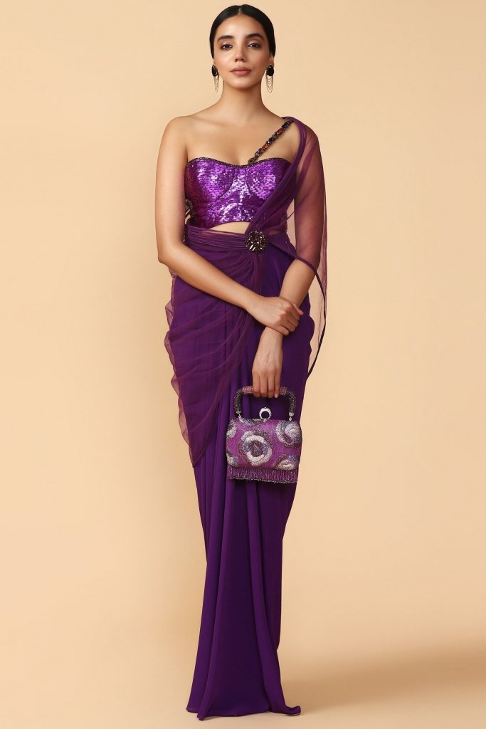 Jewel tones are always a good option for an evening occasion. If you're longing to own a piece with some feminine overlay, this purple saree is for you. The corset blouse is chic and modern and perfect for the new-age woman. Style it with diamond stud earrings and an embellished clutch.