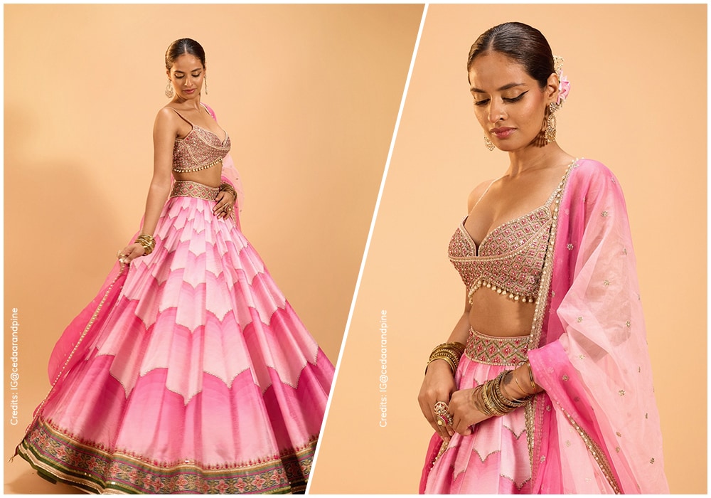 Soft, romantic, and undeniably elegant, floral blush lehengas have taken the bridal and festive fashion scene by storm. Cedar and Pine elevates this trend by incorporating delicate floral motifs that cascade across the fabric. These pieces offer a refreshing departure from traditional heavy hues, bringing a youthful and ethereal quality to your look.