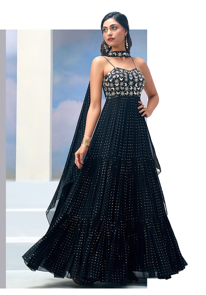 Let the moon's ethereal beauty bewitch you with Silky Bindra X Aza's captivating Chaandni Raatein exclusive collection. The exquisite range, inspired by the moon's mesmerizing glow, features stunning sequin embroidery, celestial motifs, and flattering fit-and-flare silhouettes.