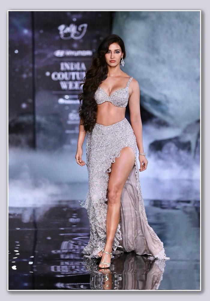 Visualising for a Selene goddess, Dolly J chose Disha Patani as her showstopper. In a silver thigh-slit mermaid silhouette skirt, pairing it with a bralette top with a plunging neckline, thin stripes and sequins that existed all over the skirt.
