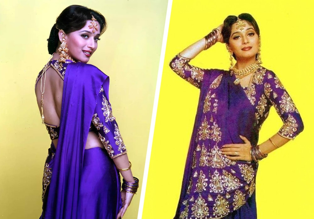 Remember Madhuri’s purple saree with the bold back in Hum Aapke Hain Koun..!, or those oversized floral lehengas layered with Kundan chokers? Every spin she did was a lesson in how to be soft and loud simultaneously. Her stacked bangles, dramatic bindis, and intricate braids loaded with gajras basically defined “more is more” way before the trend got its hashtag.