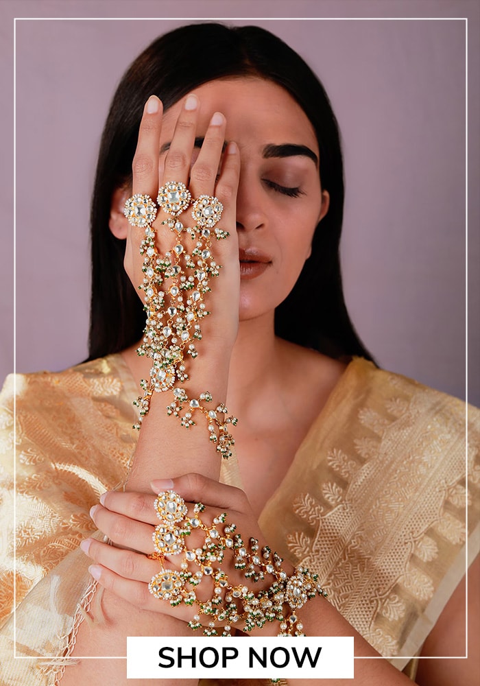 If you’re not clinking, you’re not trying. Layer chokers, rani haars, mangtikkas on foreheads, armfuls of glass and metal bangles, and a haathphool for good luck. Think Rekha at every awards show - the jewellery is never subtle, and neither should you be.