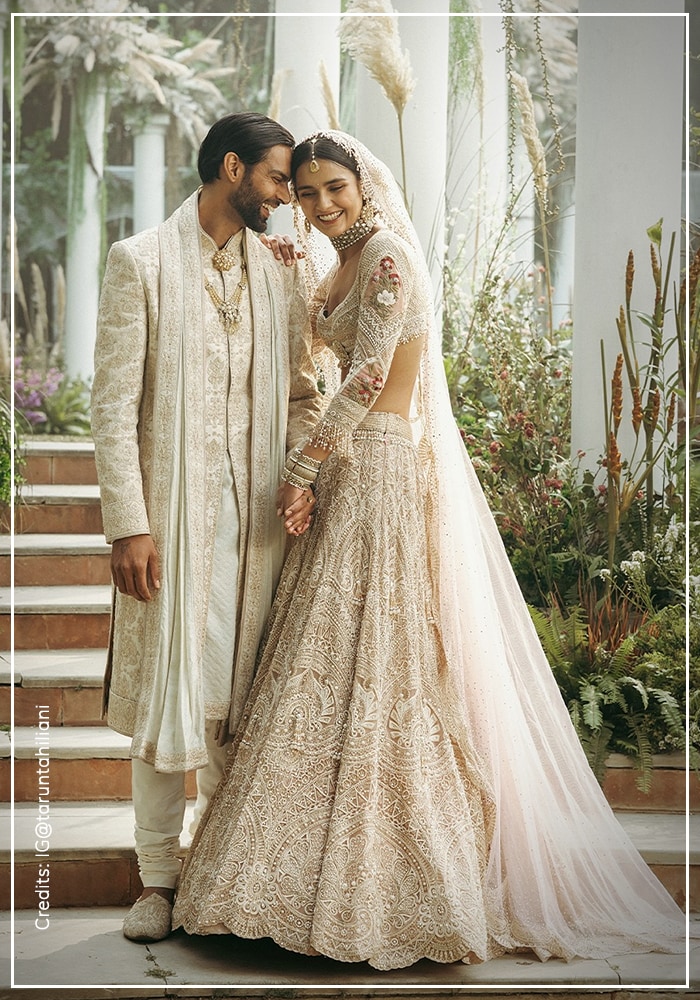 Fashion becomes art here. Brides in detailed zari lehengas, mirror work, or layered pastels are set off spectacularly by the natural backdrop. Rich velvets and silk saris shimmer even brighter against the greenery and stone, while the groom’s sherwani is embroidered with heritage motifs, paired with a regal safa—offers bold pops for the lens. For couples who love a runway-worthy moment, the ranch’s lavender fields and aged stone archways make a sublime setting for bridal portraits.
