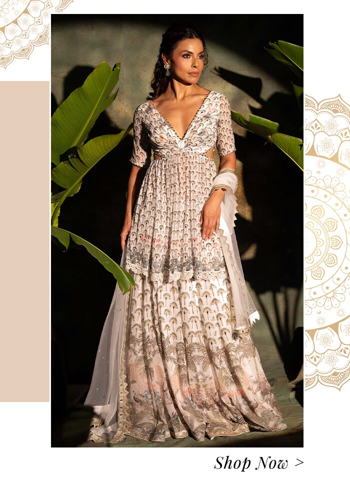When tradition meets playful modernity, you get Archana Kochhar’s ivory kurta-lehenga set. The kurta, with its deep V-neckline, waist cut-outs, and delicate embroidery, exudes understated glamour. Paired with a flowing lehenga and a net dupatta, it creates the perfect mix of sharp tailoring and feminine grace. Ideal for a New Jersey Diwali celebration, this ensemble is an effortless bridge between classic Indian Diwali outfits and contemporary festive style.