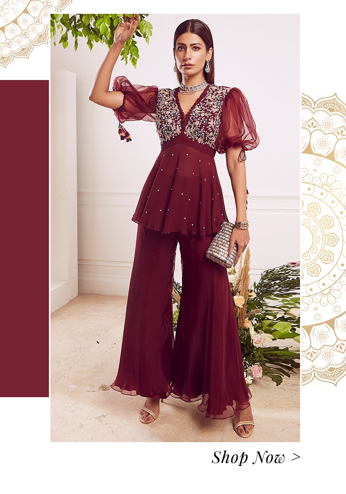 Seema Thukral reinvents festive drama with this maroon peplum pant set. The top—embellished with sequins, glass beads, and crystals—comes alive with puff organza sleeves and delicate tassel tie-ups. Flowing organza pants balance the look with modern ease, creating a silhouette that’s both regal and relaxed. Think of it as couture that dances between tradition and chic, perfect for New Jersey Diwali events where elegance deserves a playful twist.