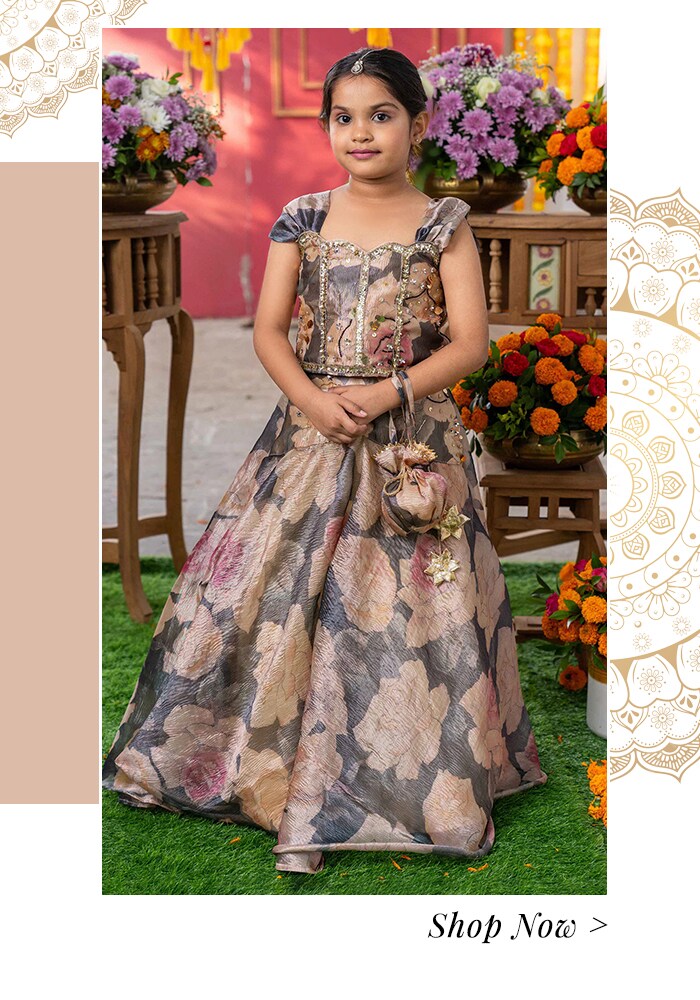 For the little fashionista, Kirti Aggarwal’s corset-inspired lehenga is pure delight. A panelled blouse dusted with sequins meets a floral-print lehenga, balancing sparkle with whimsy. Paired with a potli bag accented in blossoms, the look is festive yet comfortable—perfect for children dashing around Diwali lights. In the world of Diwali costumes, this mini-me version brings couture charm to New Jersey’s youngest revelers without sacrificing ease or playfulness.