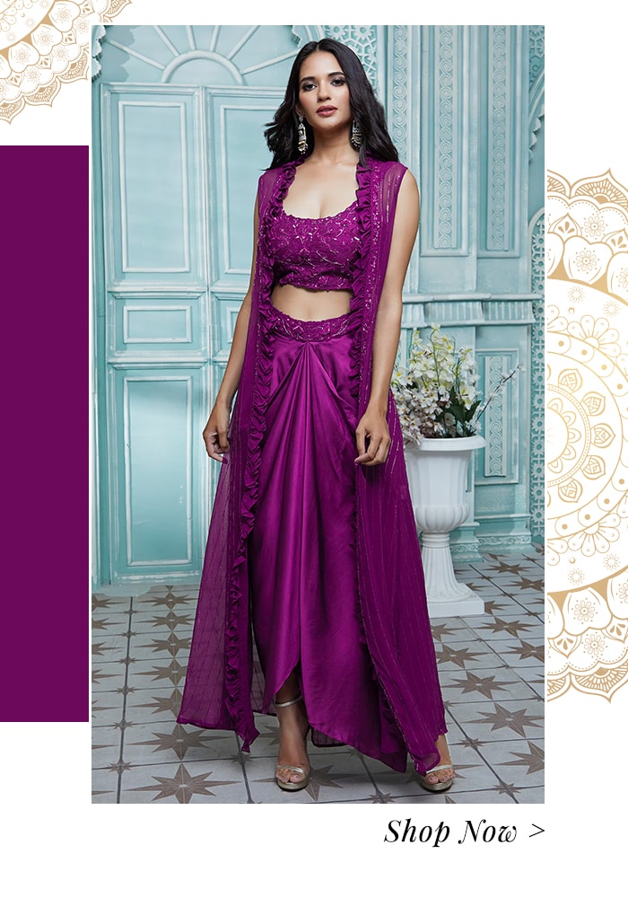 Aariyana Couture’s draped skirt set is for the bold modern dresser. The embroidered bustier, alive with floral detail, pairs seamlessly with a fluid satin draped skirt and ruffled cape. Sleeveless and open-necklined, the cape adds a dramatic layer without heaviness. This is traditional Diwali attire re-imagined is less about convention, more about expression. Perfect for New Jersey Diwali parties, where fusion fashion rules the room with unapologetic flair.