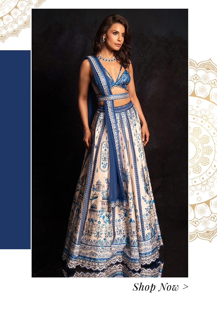 Archana Kochhar’s Indo-ethnic lehenga blends intricate floral patterns with a statement waist belt, giving the ensemble both structure and softness. The blouse, with its back tie-up detailing, strikes a balance between demure and daring. This lehenga is a celebration of heritage with modern sensibilities- a piece made for twirling at New Jersey Diwali events. If you’re exploring traditional Diwali clothing but crave a fashion-forward edge, this is the outfit that answers.